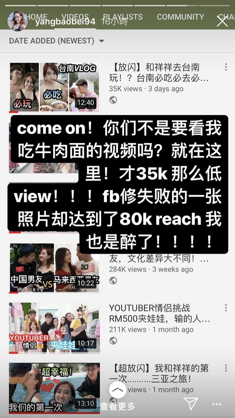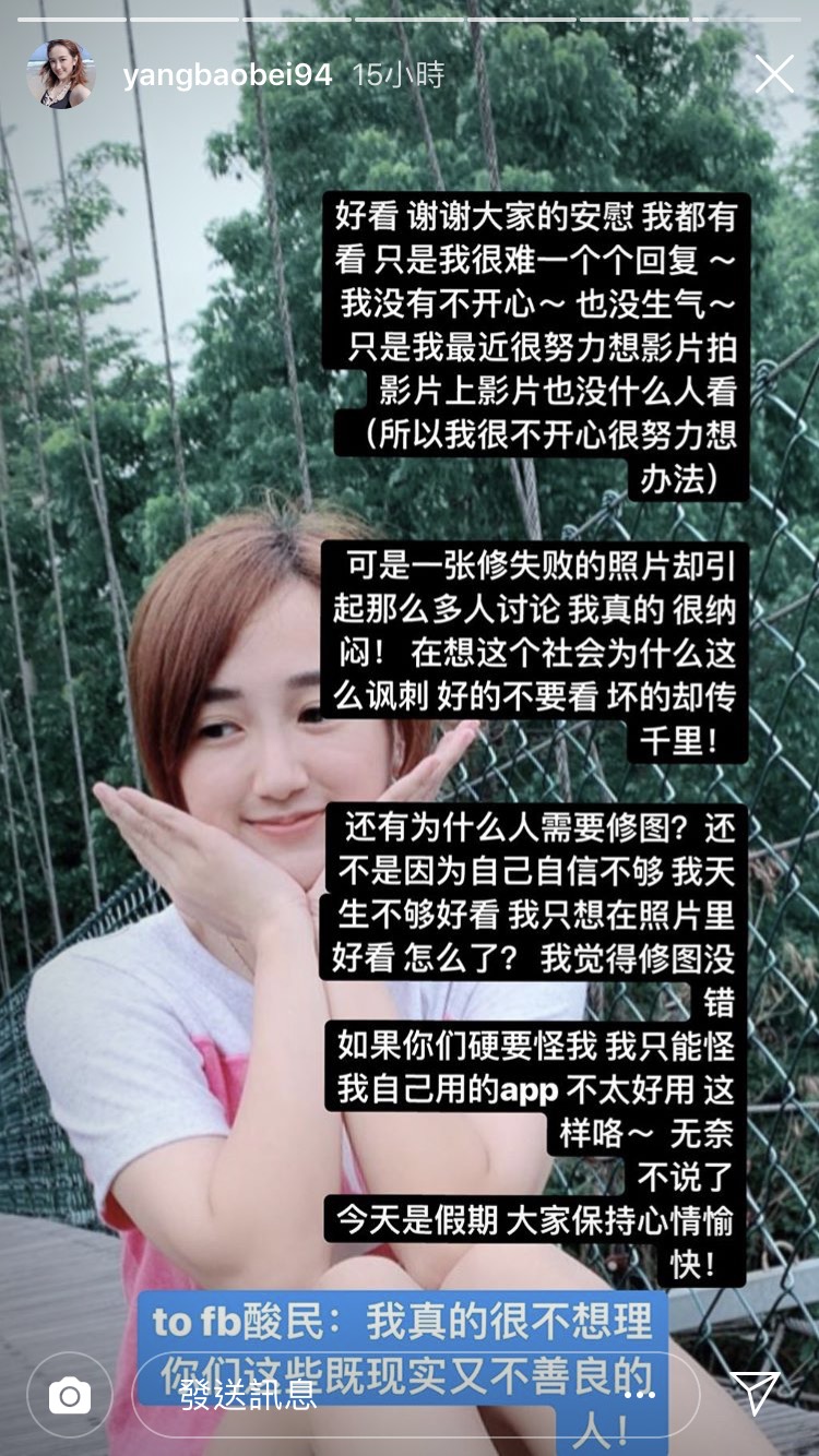 對此楊寶貝在IG限時回應:「為什麼需要修圖?還不是因為自信不夠,我天生不夠好看,我只想在照片裡好看怎麼了?我覺得修圖沒有錯」,並難過表示努力拍的影片沒人看,一張修失敗的圖卻引來熱烈討論,讓她覺得很諷刺,而針對臉書的酸民,楊寶貝更是爆氣的說:「我真的很不想理你們這些既現實又不善良的人!」