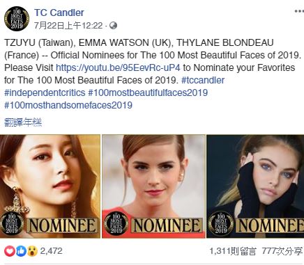 TWICE成員子瑜身為台灣人總是特別受到國內網友關注,而她的美貌甚至早已揚名國際,在2019年「TC Candler」的世界百大美女入圍排行榜中,子瑜更是第一個被公開在IG的女星,而此前排名也逐年升高在2018年拿下亞軍,同時也是當年「亞洲最美女星」。