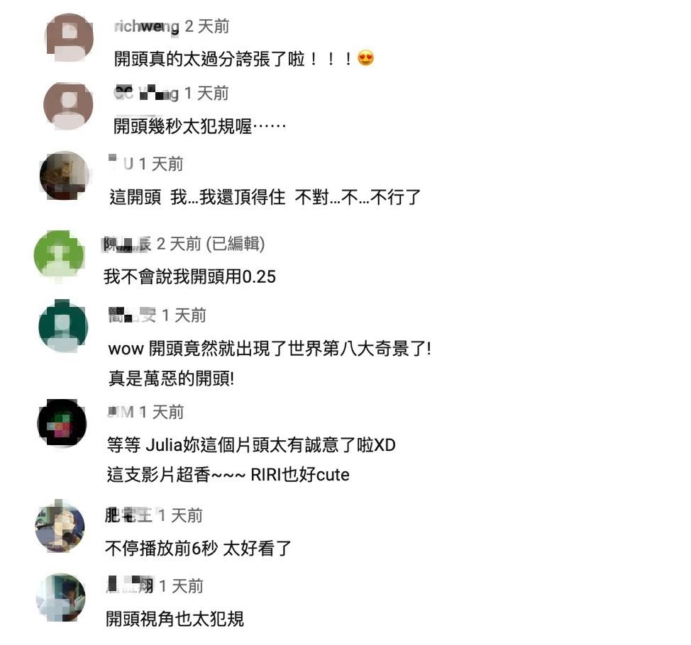 在影片一開頭時,Julia從一家店走出來,而她也停在鏡頭前接著她就直接蹲下,而當她蹲下時因為她穿著一件小洋裝因而露出了大半部分的大腿根,姿勢與鏡頭的畫面都非常撩人,雖然僅出現短短幾秒的時間,但許多網友都在留言區中暴動:「開頭真的太過分誇張了啦!」、「開頭幾秒太犯規喔……」、「這開頭 我…我還頂得住 不對…不…不行了」、「開頭竟然就出現了世界第八大奇景了!真是萬惡的開頭!」、「等等 Julia妳這個片頭太有誠意了啦XD」