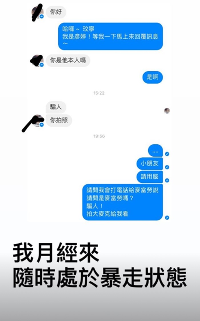 沒禮貌的私訊讓彥婷爆氣開嗆,「小朋友,請用腦,請問我會打電話給麥當勞說,請問是麥當勞嗎?騙人!拍大麥克給我看。」最後彥婷將斷話截圖,並公開貼在自己的限時動態寫下,「我月經來,隨時處於暴走狀態!」