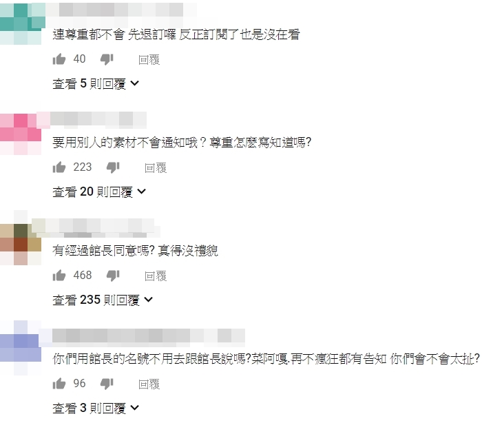 館長昨晚開直播時表示,自己非常支持年輕人、Youtuber,只要講一聲都可以用,「反骨你都沒有講,你是白目嗎?你當做你他X的想用就用是不是?」同時館長也提到,蔡阿嘎、在不瘋狂就等死都有先告知才翻拍,自己並非要收錢,但是尊重要給,「用我的東西在那邊搞笑,汙辱我形象我不在乎,要不要我教你甚麼叫尊重?」對於反骨未告知便翻拍一事相當生氣。
