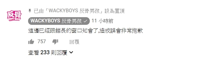 館長怒噴一波後,反骨男孩的相關人員也立即向館長道歉,並在自己的影片下方留言,「這邊已經跟館長的窗口知會了,造成誤會非常抱歉」。館長也大方原諒反骨男孩的過錯,他表示,「反骨有致歉了,他們也是優秀的新人,謝謝大家關心感謝。」讓整起事件和平落幕。