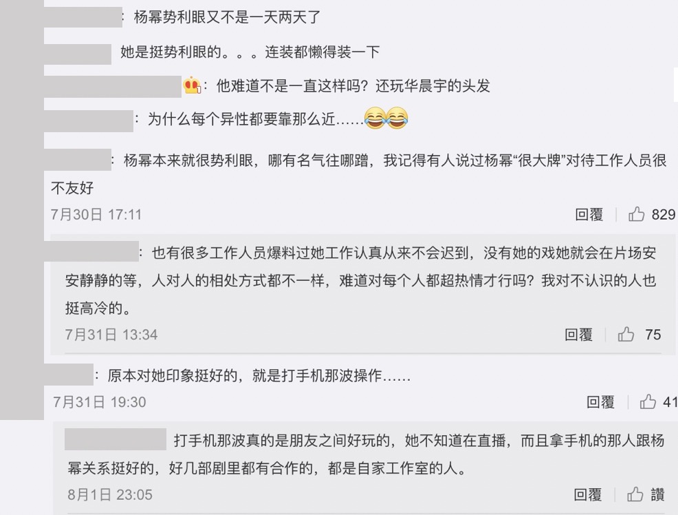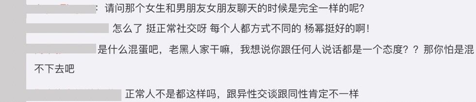 近期有知名娛樂博主再度討論起楊冪過去和男藝人的互動,他也發出多張楊冪和男藝人交談時的照片以及GIF檔,從照片中發現楊冪在和男藝人交談時,楊冪都會露出比較嬌羞的表情,肢體動作也會比較多,而從該位博主提供出來的檔案中,楊冪和女藝人交談時就比較隨性與豪放,原PO發文時也寫下:「楊冪跟男性交談比較害羞,跟女性貌似就比較豪放?,你怎麼看」,也引起許多網友進行兩面的討論。