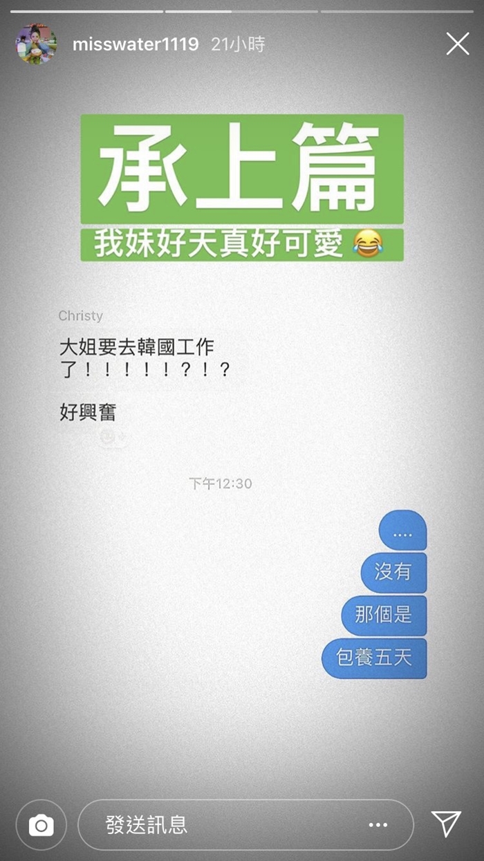 開水小姐將訊息公開後,有親友忍不住替她開心傳訊息表示,「大姊要去韓國工作了?!好興奮!!」開水小姐只能無奈回應,「沒有…那個是包養5天!」面對妹妹天真的回覆,讓開水小姐直呼「我妹好天真好可愛XD」