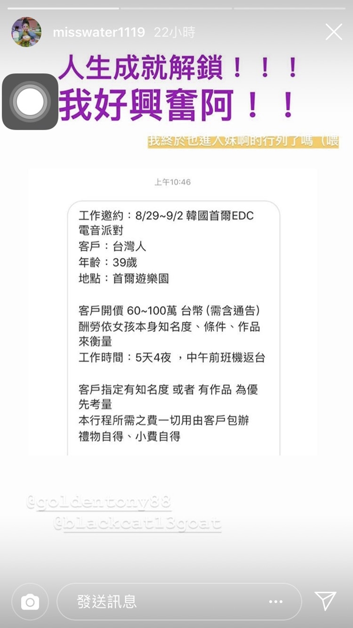 開水小姐時常在IG限時動態中跟粉絲互動,近日她公開一則工作邀約,內容是到電音派對工作,不過仔細一看就能發現端倪,訊息中寫著「客戶國籍、年齡、禮物自得、小費自得」,讓開水小姐無奈笑說,「人生成就解鎖!好興奮啊!我終於也進入妹啊的行列了嗎?」