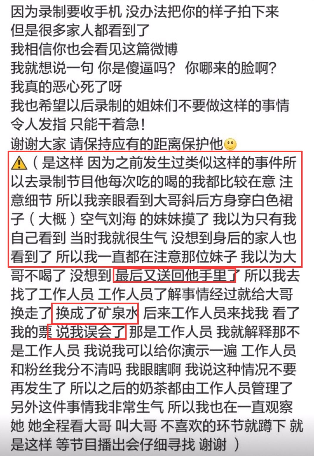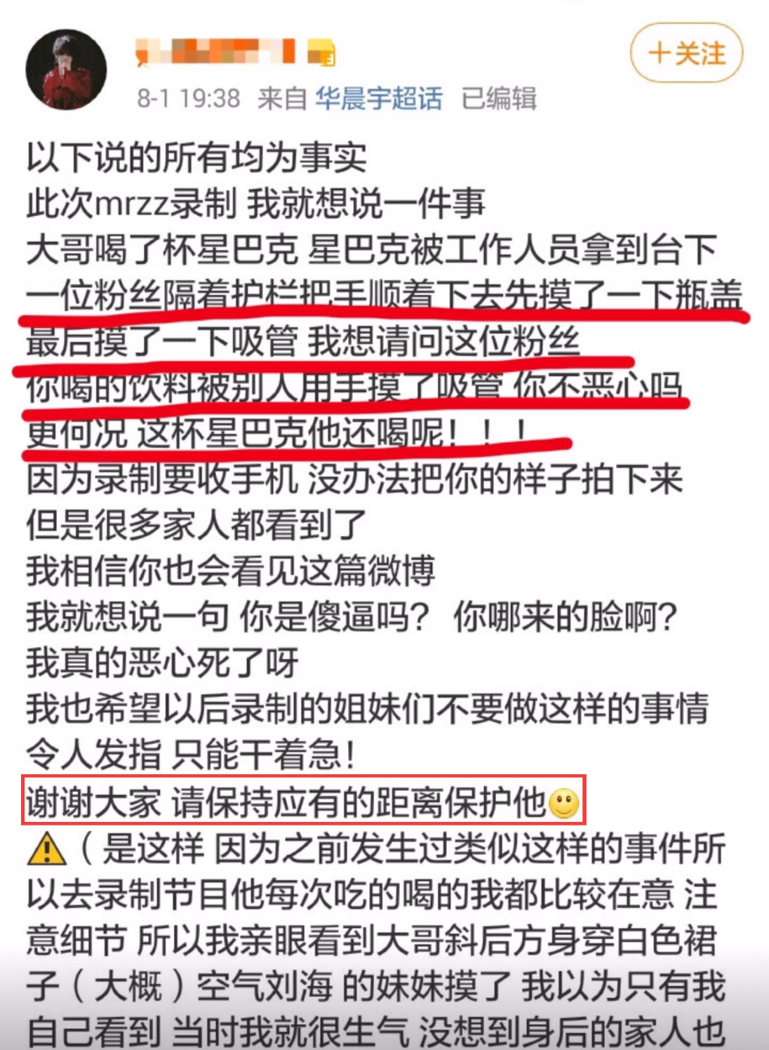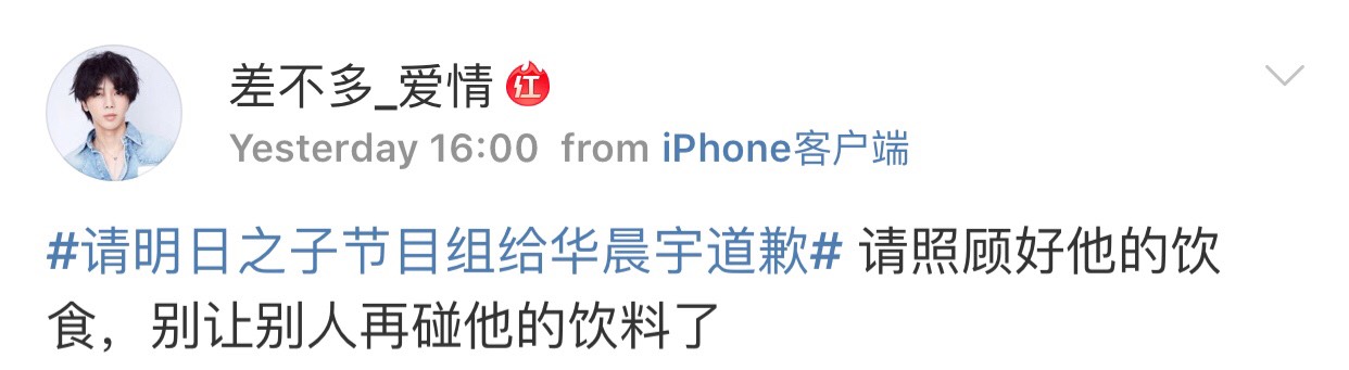 根據微博上資料顯示,華晨宇在節目錄製時,飲料喝完後被工作人員拿下台,被一位喜愛他的粉絲隔著護欄「順手摸了一下瓶蓋以及吸管」,目擊者表示當下以為這杯飲料不會再回到華晨宇手中,但隔了一段時間,工作人員卻將那杯飲料原封不動的給華晨宇喝了,就算那位粉絲去跟工作人員反應這件事情,現場的人只說知道了,但卻「不做任何作為」,對於藝人來說這真的很危險,況且不知道這位粉絲的手沾過什麼東西,網友直說:「真的太不衛生,好噁心」。