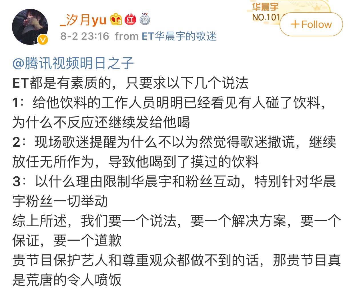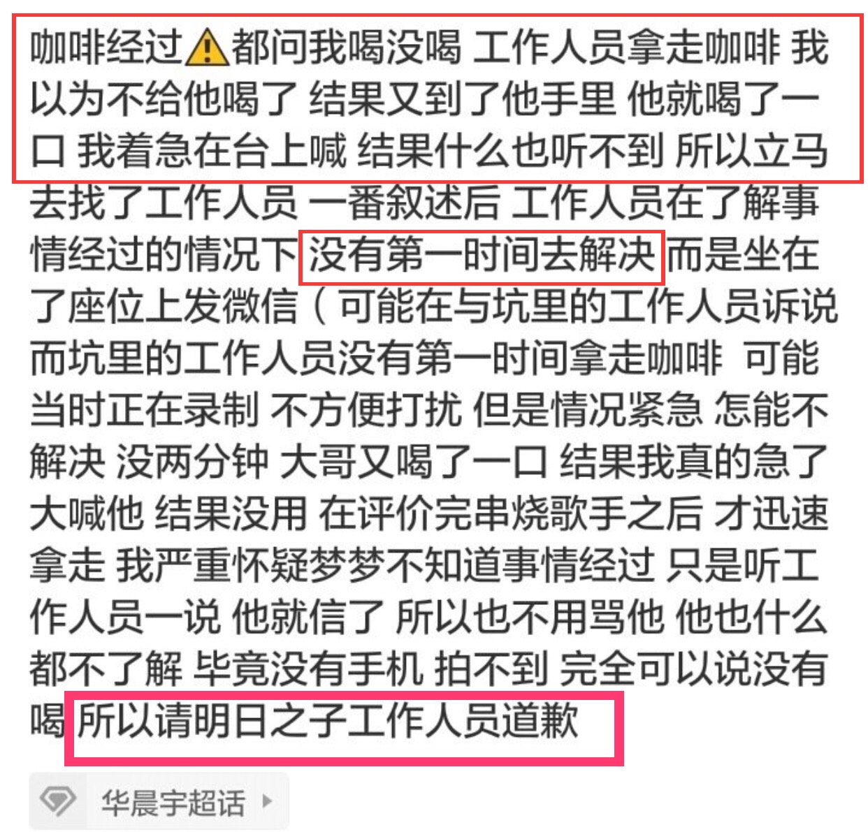 當事者事後表示他清楚知道是哪位粉絲摸了那杯飲料,他以為只有他看到但站在身後的粉絲也表示也有看見這一幕,更找了工作人員理論,才要把飲料換成礦泉水,現場工作人員還質疑目擊者撒謊,讓他十分氣憤,這一整件事情因為工作人員的緣故,沒得能夠及時阻止,還讓華晨宇喝了那杯飲料,對於藝人的安全把關,粉絲要求明日之子的工作人員慎重道歉:「一個說法、一個解決方案、一個保證何一個道歉。」,到目前為止官方尚未給出任何回應。