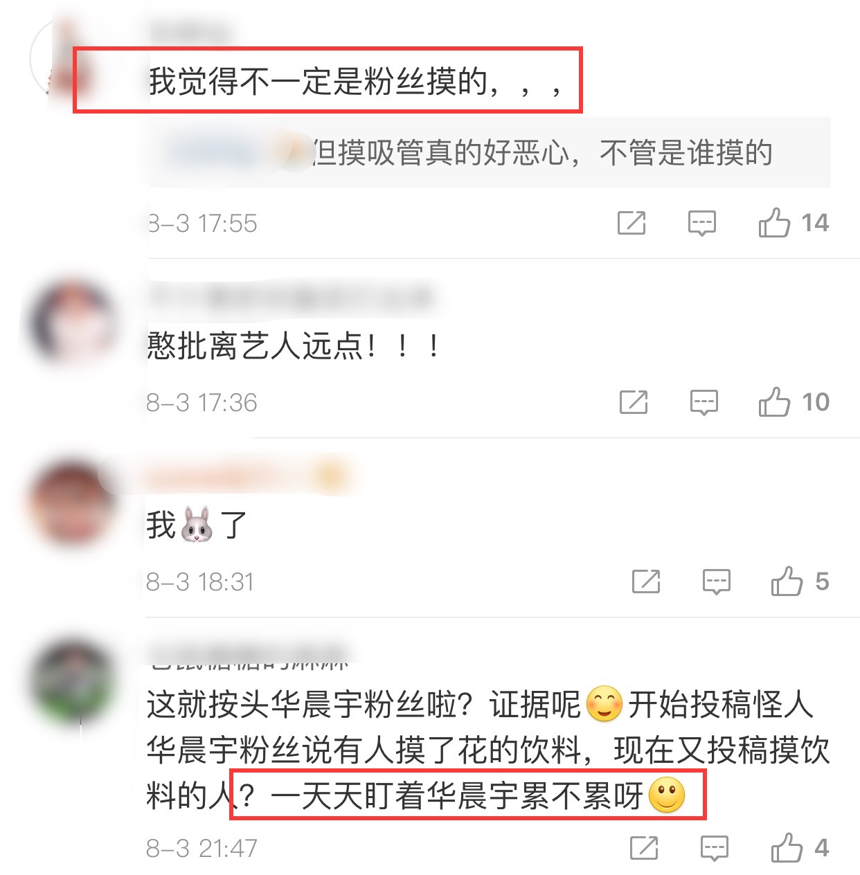 對於華晨宇飲料事件一事,不少粉絲對於這樣的行為有不同的聲音出現,有人覺得:「不一定是粉絲摸的」、「一天天盯著華晨宇累不累呀」,但另外有人覺得:「正常情況下不應該第一時間解決嗎」、「太噁心了吧」、「吸管被陌生人喝了你還會想喝嗎」,讓粉絲超級心疼,並且呼籲:「請照顧好他的飲食,別讓別人再碰他的飲料了。」
