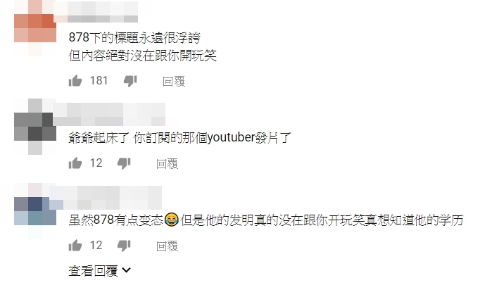 878發布最新影片,令不少網友感到激動表示,「爺爺起床了,你訂閱的那個youtuber發片了」,另外有許多粉絲相當好奇878的學歷,因為發明實在太猛!也人紛紛敲碗希望878有一天能解釋自己的發明,「每次看都半信半疑,但是還是很愛看XD這次看起來更真實,好奇怎麼讓他急凍的啊?」