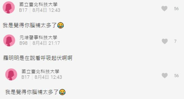 部分網友認為,單純討論羅志祥的這句話似乎有點斷章取義:「單看羅講這句話我也覺得有點不ok,不過我覺得他應該主要是想表達『穿這樣可以很容易看出=心跳呼吸,妳敢穿這樣就不要怕我看你心跳還有呼吸啦XD』」、「雖然我不喜歡他但還是想稍微幫他說一下話」、「老實說他也就真的只是一個梗(不要怕被看呼吸起伏大小)」、「羅明明是在說看呼吸起伏啊啊」、「但羅的意思是說『敢穿這樣,就不要怕被看心臟跳快不快』吧」。
