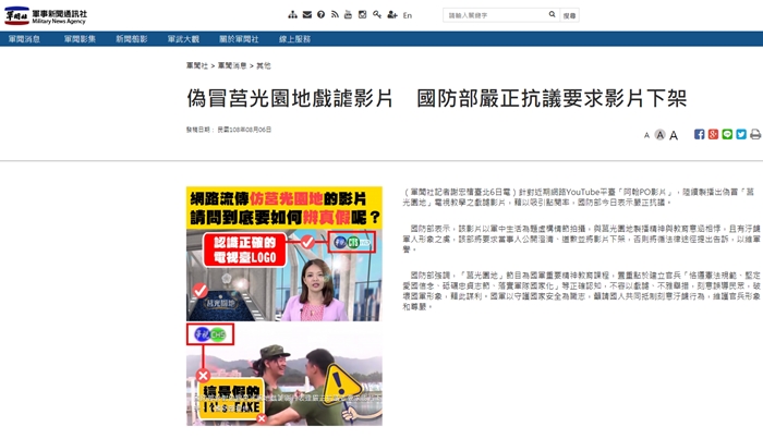 國防部今日發出聲明,針對「阿翰PO影片」中偽冒「莒光園地」的戲謔影片嚴正抗議。國防部也表示,「該影片以軍中生活為題虛構情節拍攝,與莒光園地製播精神與教育意涵相悖,且有汙衊軍人形象之虞,要求當事人公開澄清、道歉並將影片下架,否則將循法律途徑提出告訴,以維軍譽。」