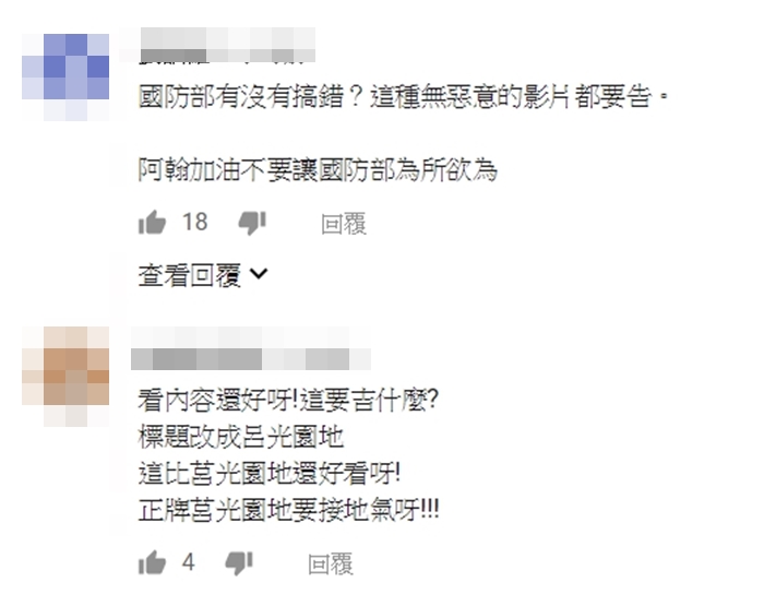 而阿翰的頻道中,仍有其他模仿「莒光園地」的影片,有網友在下方留言表示力挺,「國防部有沒有搞錯?這種無惡意的影片都要告。」、「看內容還好呀!這要吉什麼?」、「國防部是不是忌妒」。