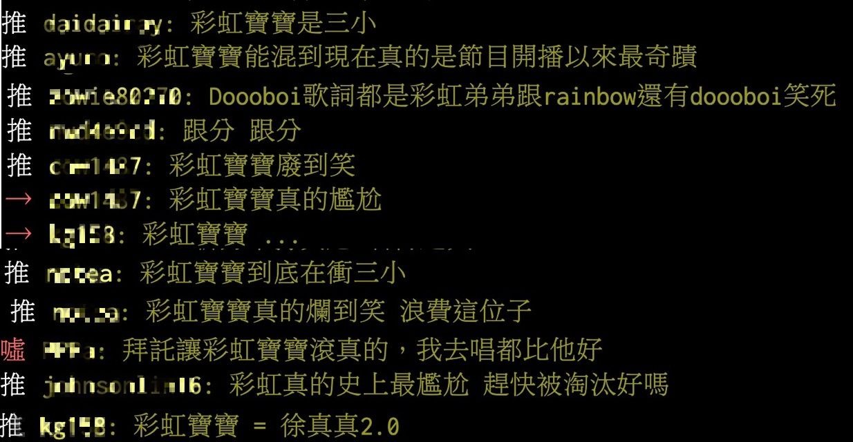 接著在最後一輪時,戰隊可以派出三名選手進行PK,其中岳凡岳狗戰隊最後派出DOOOBOI進行演出,但他的演出似乎有些失利,唱完之後潘瑋柏更毒舌的詢問吳亦凡:「他唱了啥?」,鏡頭特寫吳亦凡的臉似乎有些嚴肅。而網友看見DOOOBOI兩輪的演出後也傻眼的留言:「彩虹寶寶真的尷尬」、「彩虹寶寶真的爛到笑 浪費這位置」、「彩虹寶寶廢到笑」、「彩虹寶寶到底在衝X小」,更有網友表示他是徐真真的接班人。