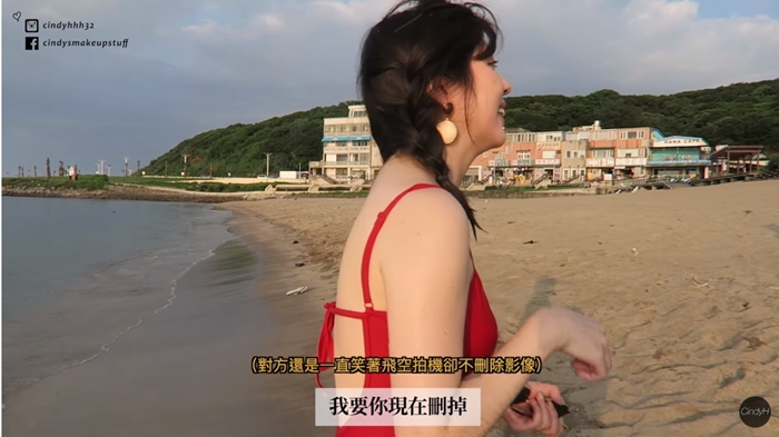 Cindy這天在影片中聊到拍攝穿搭的背後故事,當時她前往白沙灣拍攝泳裝,卻發現有台空拍機不斷在上方盤旋,甚至直接停留在Cindy頭的正上方,讓她確定空拍機是在拍自己沒錯,因此找到該名操控空拍機的男子,要求對方刪除,起先對方還嘻皮笑臉認為「沒關係」,直到Cindy態度強硬,男子才願意當場刪除影片。