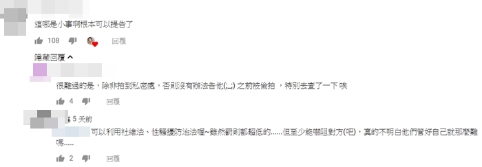 Cindy影片一出後,引來不少網友留言力挺,除了許多網友表示感同身受,也有人直接點出,「這哪是小事,根本可以提告了!」事實上,雖偷拍極有可能觸及《民法》、《刑法》等相關法條,但是否負擔刑責,仍取決於法官最終的判決,但以道德面而言,仍是極具爭議的行為。