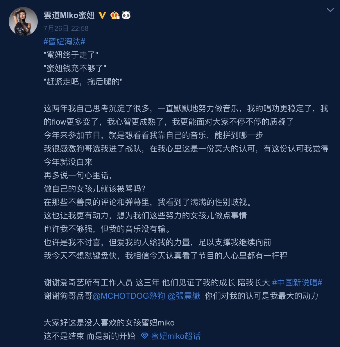 然而當時蜜妞被淘汰後也在微博上發文:「這兩年我自己思考沉澱了很多,一直默默地努力做音樂,我的唱功更穩定了,我的flow更多變了,我心智更成熟了,我更能面對大家不停不停的質疑了」,也提到很感謝熱狗與張震嶽當時挑選她進入戰隊,而面對那些酸言酸語蜜妞也寫了一首歌曲《我》,裡面傳遞出許多想對酸民們說的話:「我學會酸甜苦辣都往嘴裡咽,人生的十字路口走過好幾遍,你也許依然站在我的對立面,我依然保持真實其他隨你便」,傳達她不論外界如何評價,她依然會做自己。