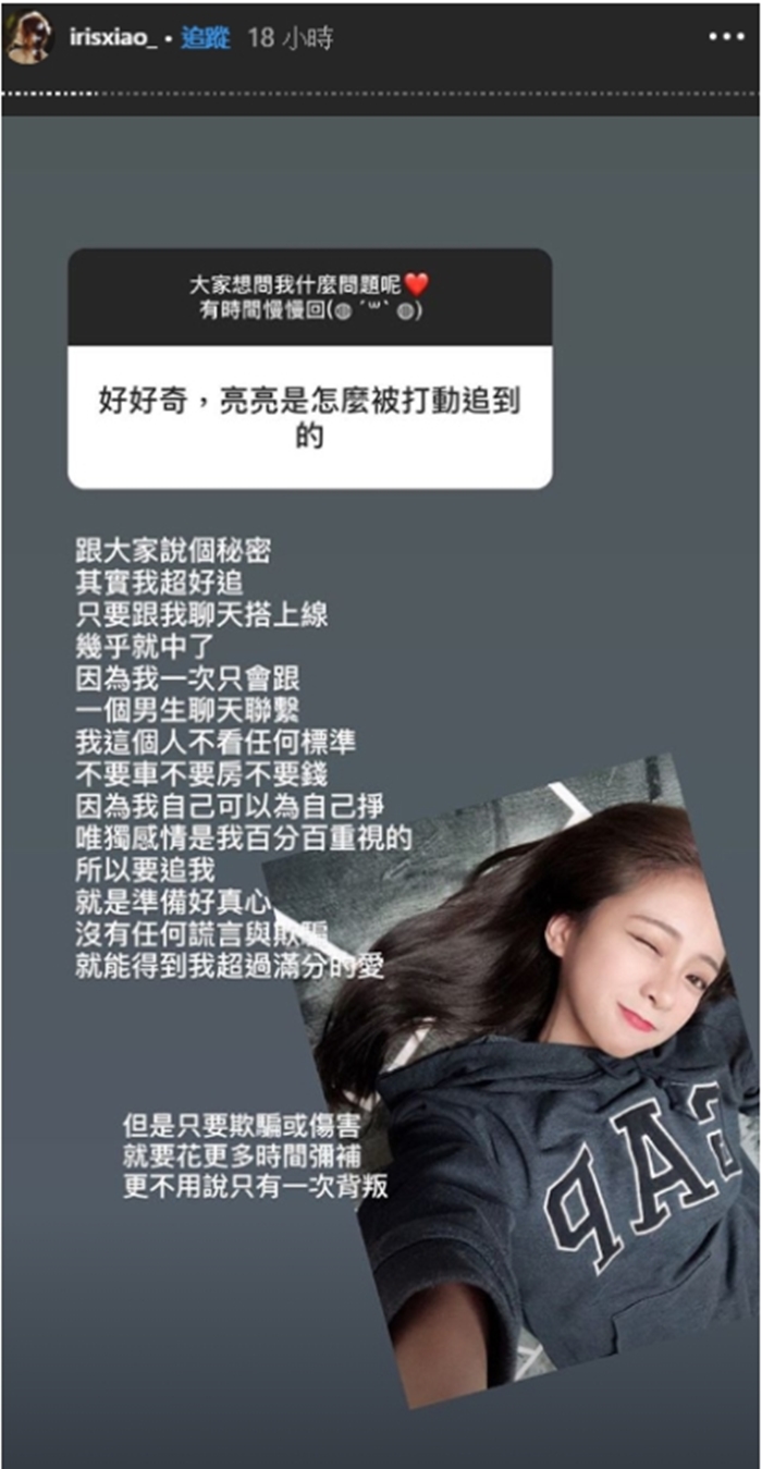 前陣子也有網友詢問閃亮亮「兩人從相識到相戀的過程」,閃亮亮提到,就如影片中那樣,因為黃包包到攤販搭訕才認識的;被問起怎麼被黃包包打動,閃亮亮則表示:「其實我超好追,只要跟我聊天搭上線,幾乎就中了,因為我一次只會跟一個男生聊天聯繫,我這個人不看任何標準,不要車不要房不要錢,因為我自己可以為自己掙,唯獨感情是我百分百重視的。」只要對方有真心,自己便會回應滿分的愛!