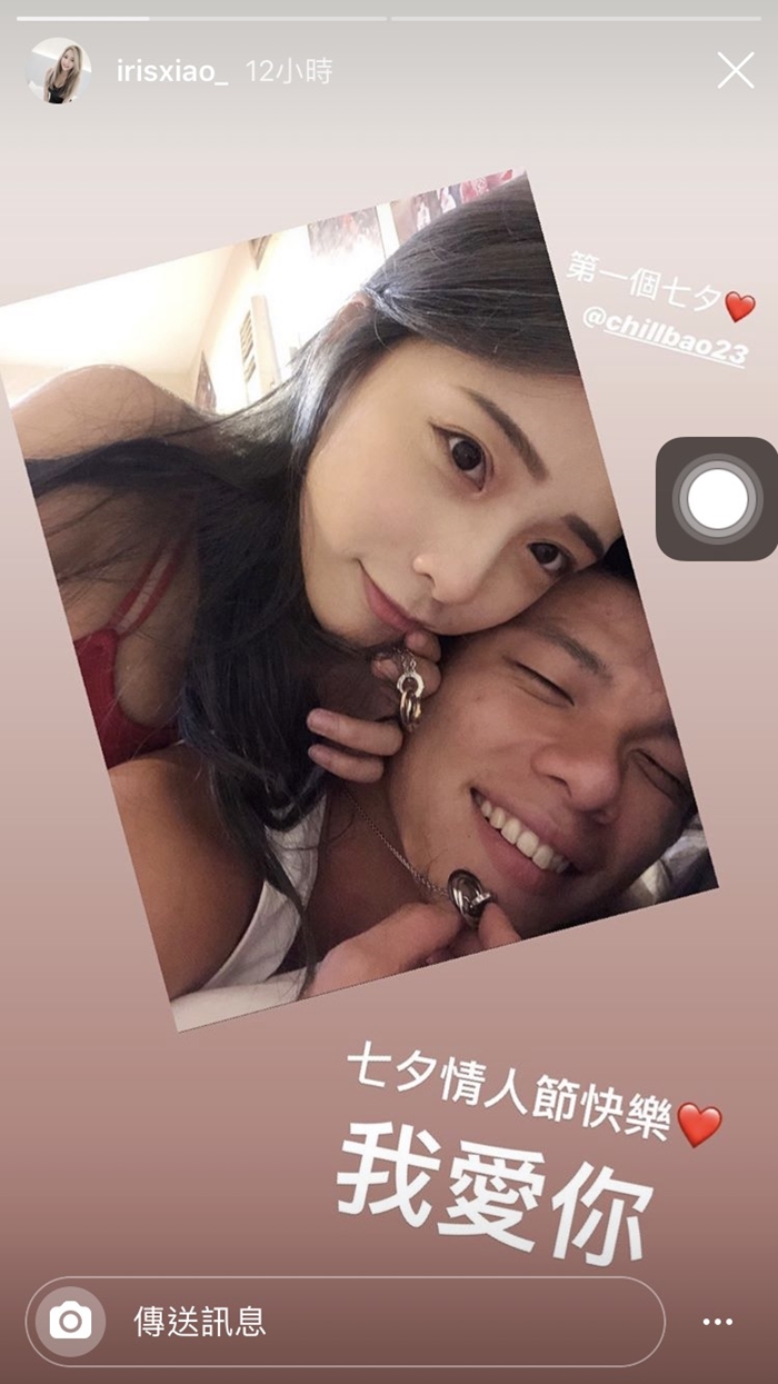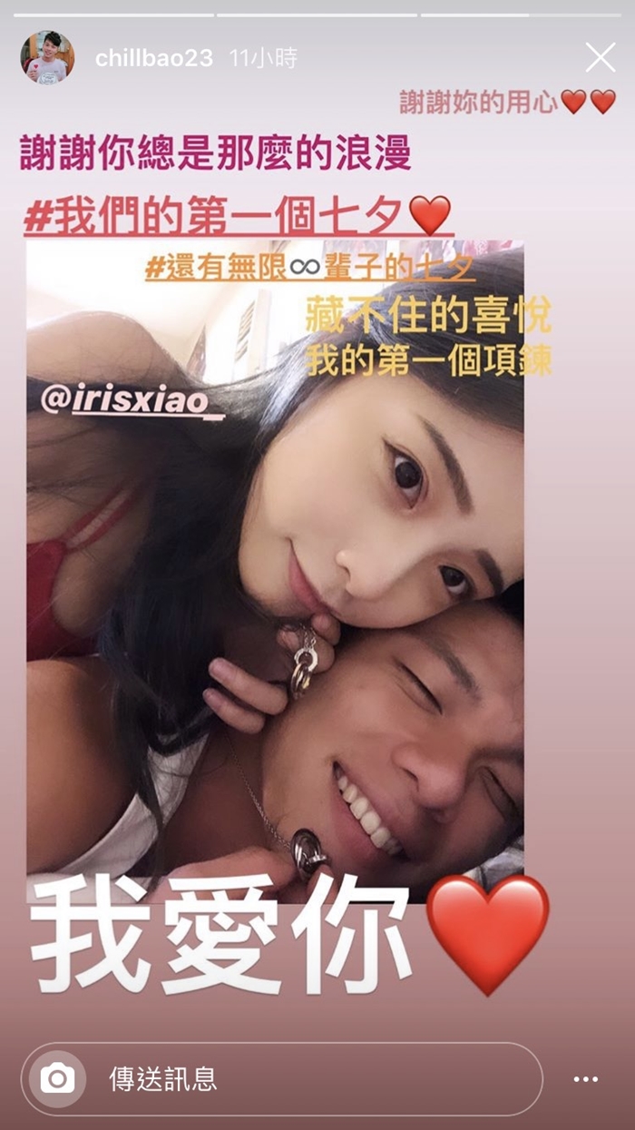 今天是七夕情人節,情侶檔閃亮亮、黃包包放閃不落人後,大半夜互相示愛PO限時,照片中閃亮亮甜蜜地趴在黃包包身上,兩人一起曬出情侶項鍊,瞬間讓粉紅泡泡佔滿螢幕,黃包包更是感性告白,「謝謝妳的用心,謝謝妳總是那麼的浪漫,我們的第一個七夕,還有無限輩子的七夕,我愛你!」