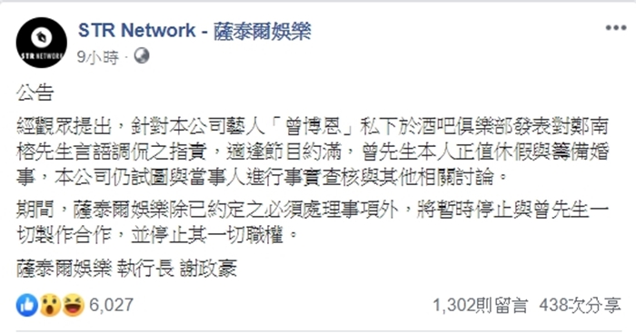 博恩所屬的經紀公司「薩泰爾娛樂」今早發出聲明,「針對博恩私下在酒吧俱樂部發表對鄭南榕先生的言語調侃,適逢節目約滿,博恩本人正值休假與籌備婚事,會再和當事人進行事實查核與其他討論。期間,本公司除已約定必須處理的事項外,將暫停與曾先生一切製作合作,並停止其一切職權。」