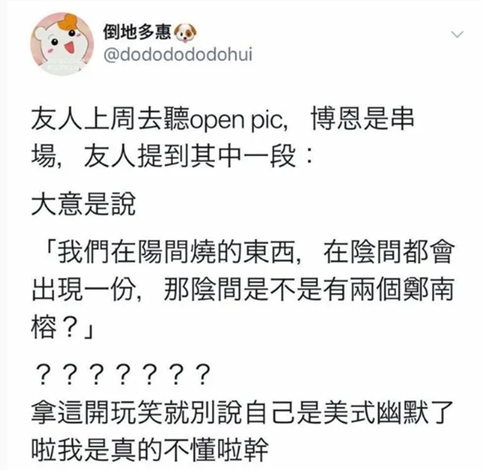 曾博恩疑似在私下講出有關「鄭南榕」自焚一事的地獄梗,被網友在推特上爆料,「朋友上週去聽open pic,博恩是串場,其中一段講到:我們在陽間燒的東西,在陰間都會出現一份,那陰間是不是有兩個鄭南榕」此事也在網路上漸漸發酵。