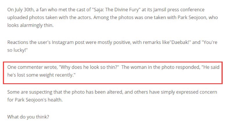 國民男友朴敘俊近期除了客串《寄生上流》,也在最新一部電影《The Divine Fury驅魔使者》擔任第一男主角,在7月30日《The Divine Fury驅魔使者》的粉絲見面會上,朴敘俊與一位女粉共同合照,在instagram照片中朴敘俊身穿全黑色系西裝,左手輕撫著粉絲卻沒有實體的肩膀碰觸,十分紳士。但是仔細一看朴敘俊的臉,發現兩頰兩邊似乎凹了進去,就連眼窩都瘦到下陷,讓不少粉絲質疑「是不是修圖修過頭了」、也有粉絲擔心問「朴敘俊為甚麼看起來那麼瘦」,讓當事人跳出來澄清「他(朴敘俊)說他最近體重減輕了」。