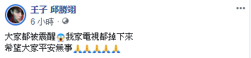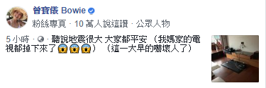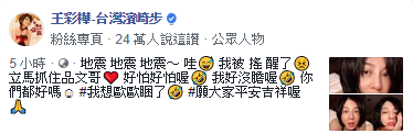 藝人王彩樺在被地震嚇醒第一時間馬上發文報平安,並附上睡眼惺忪的自拍供粉絲一飽眼福,王子則表示自己被嚇醒,家裡電視都掉下來,希望大家平安無事,曾寶儀媽媽家的電視更是直接被震到正面朝下,但所幸無其他傷亡。
