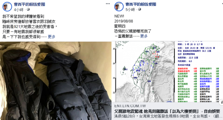 曹西平更是嚇到連發6篇文,除了回想到921地震的災情之外,並表示自己現在變得很敏感,只要晃一下下就能感受的到,自從921地震後床旁邊隨時會備著雪衣和羽絨衣,以免地震來臨時裸體跟大家見面,粉絲也紛紛贊同「921真的無法忘記」、「生命很脆弱、大家珍惜眼前一切事物」。