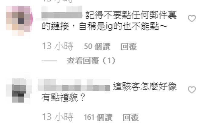 貼文一出後,有人提醒酷炫,「千萬不能點任何郵件裡的連結,自稱是IG的也不能點!」、「盡量不要回覆,回覆了會讓他更精準的定位你的IP」另外也有粉絲認為對方是駭客可信度很高,「很多駭客剛起步會去駭一些粉絲多的帳號練習」!