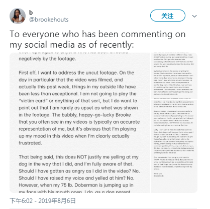 事後,Brooke Houts在網上發表聲明稿,澄清虐狗舉動並解釋「很明顯在片段中的我心情不好,平常的影片才是真正的我」,接著也表示斥喝口吻是「是因為狗狗撲向我」。不過網友對她的說法並不買單,有網友表示「應該把你的狗送給一個會喜歡和訓練它的人」、「這種情況令人感到很不安」、「人神共憤」。