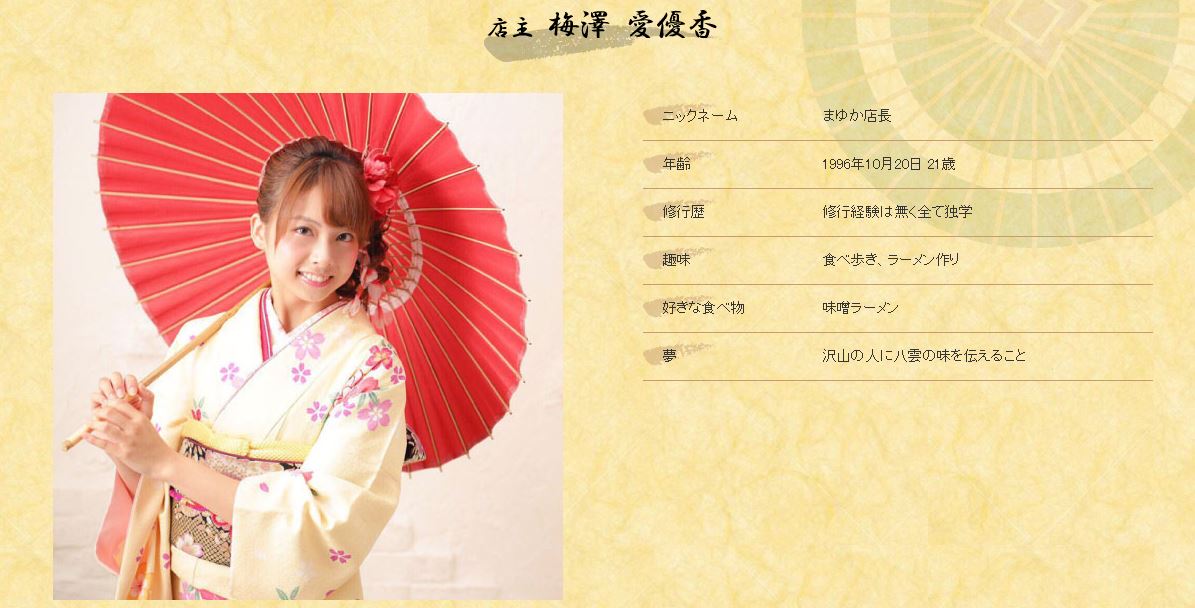 梅澤愛優香在1996年出生,今年才僅僅23歲,但她從偶像退役之後,選擇開了一間拉麵店,和一般投資人不同,她不僅在店裡幫忙,也會到廚房煮拉麵,並端上餐桌到客人面前。