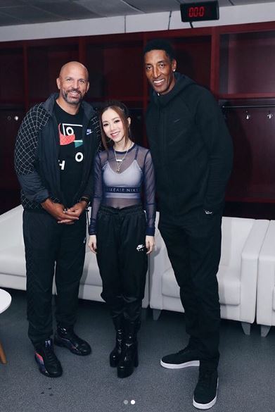 而最近剛推出新歌而忙於工作的鄧紫棋昨日(8),遇到NBA球星,立刻和潘瑋柏化身球迷求合照,她內搭一件白色運動內衣,外面僅罩一件黑色薄沙,隱隱約約透出馬甲線,非常性感,而下身穿了一件運動時尚黑褲搭上黑色恨天高,看似衝突的搭配卻充滿了時尚感。