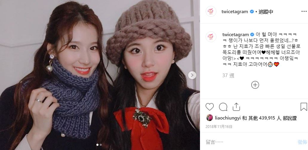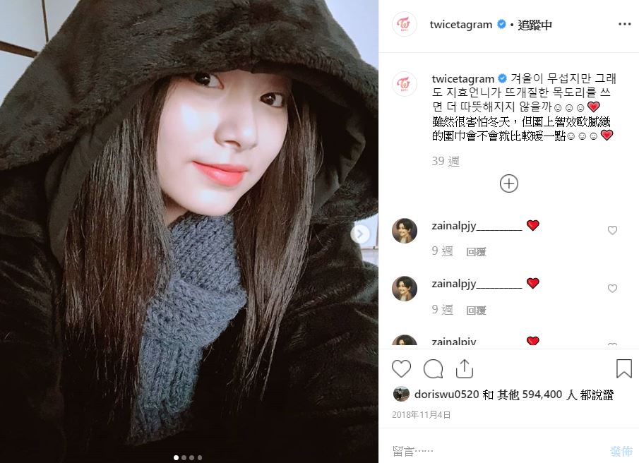 會有這樣的猜測是因為去年相近的時間,成員子瑜於11月中也在TWICE官方IG公開灰色圍巾自拍照,兩款灰色圍巾不論顏色或紋理都相當雷同。當時子瑜還在文中暖心表示「雖然很害怕冬天,但圍上志效歐逆織的圍巾會不會就比較暖一點」,而11月中,Sana和彩瑛也曾帶著圍巾和毛帽一同合照。