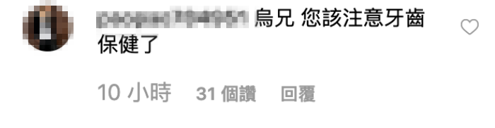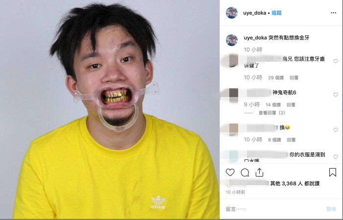 烏鴉今天在IG上貼出一張露出全齒的照片,同時註解寫下「突然有點想換金牙」,只見照片中的每顆牙齒都見不到一點白,嚇人的模樣讓粉絲紛紛留言,「這…這…是口腔癌吧!」、「嗚兄,您開注意牙齒保健了」、「他X平日不刷牙是吧」、「天啊!這個牙齒很毋湯」、「嚇死!我以為滿滿的焦油欸」。