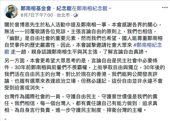 關於曾博恩先生於私人活動中提及鄭南榕一事,本會感謝各界的關心,無法一一回覆敬請各位見諒。主張言論自由的原則上,我們也相信,「幽默」是自由社會的重要元素,然而我們也希望,國人能尊重鄭南榕自焚事件的歷史嚴肅性,因此,本會誠摯邀請社會大眾來 #鄭南榕紀念館 走一趟,親身認識鄭南榕生平與其主張,了解言論自由真諦。