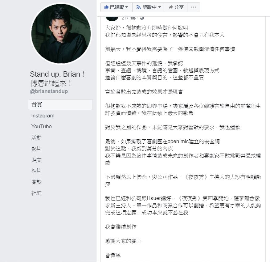 「博恩」在事件燃燒多日後,於粉絲專頁上公開道歉,並針對此事件所遭受負面情緒的鄭南榕家屬表達歉意,此外,他坦言「我不樂見因為這件事情造成未來的創作者和喜劇家不敢挑戰禁忌或權威」,表露出了對喜劇創作表演的擔憂。最後,「博恩」更拋下震撼彈,說道「《夜夜秀》第四季開始,薩泰爾會徵求新主持人。」,讓喜愛「博恩」的粉絲們無法接受。