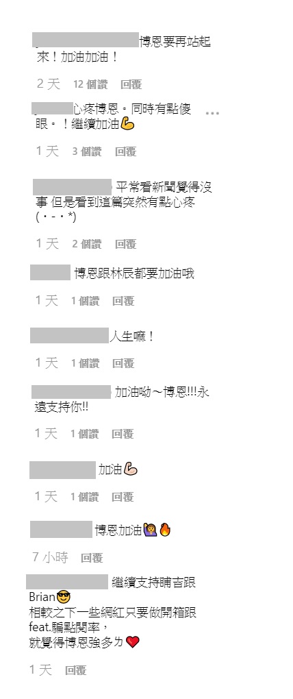 而網友們也紛紛在此貼文下方留言表示「博恩要再站起來!加油加油!」「心疼博恩。同時有點傻眼。繼續加油!」「博恩跟林辰都要加油哦」「加油呦~博恩!!!永遠支持你!!」,希望此段風波能趕快撥雲見日,「博恩」能重新將歡笑帶給喜愛他的觀眾們。