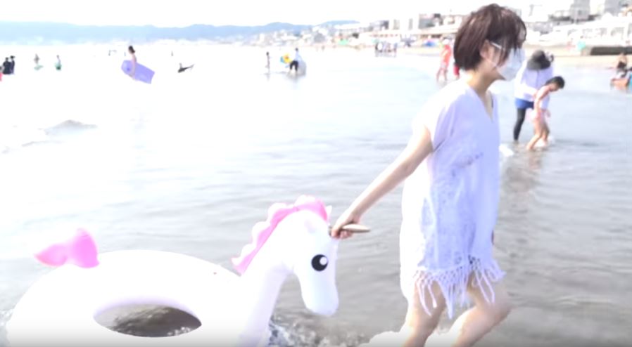 不過接著拿了泳圈下海的丸の内OLレイナ,卻因為數度被浪捲進海裡,Bra竟然當場掉了。拿著獨角獸泳圈的丸の内OLレイナ試圖想坐穩並躺平在海中,不過當天海況不佳導致丸の内OLレイナ數度被捲入海裡,最後就連塞在胸部的Bra都被沖走,決定休息的丸の内OLレイナ雖然照著白T,卻仍明顯可見原先豐滿的胸型已經變得相當平坦,畫面一出也讓網友尷尬表示「小胸也很棒啊」、「不管有沒有胸,在我心中都很正啦」。