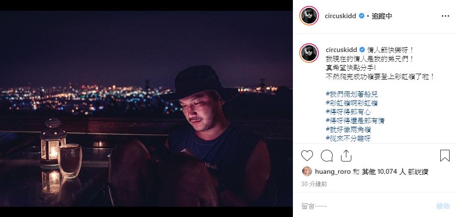 KID今年4月宣布入伍,暫停了演藝圈的工作,但網友們都相當期待他的回歸。7日七夕情人節,KID在社群網站上PO出一張夜景照,先是祝福粉絲們情人節快樂,逗趣說自己現在的情人是「軍中的弟兄們」,還笑說:「真希望快點分手!不然爬完成功嶺要登上彩虹嶺了啦!」依舊不改他幽默的本性。