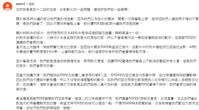 壽喜燒店評價影片一出後,又再度引來網友議論,認為Toyz將肉煮太熟,本來口感就會不好,而店家也親自出面回應Toyz覺得不優的部分,也承諾有些地方會再改善,並謝謝Toyz的批評指教。