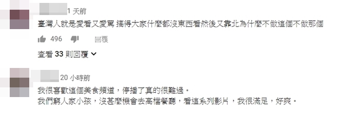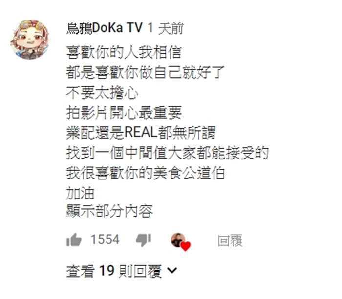 公告停播影片發出後,有不少網友不捨留言,「就是愛看又愛罵,搞得大家什麼都沒東西看然後又靠北為什麼不做這個不做那個」、「我們窮人家小孩,沒甚麼機會去高檔餐廳,看這系列影片,我很滿足」、「說真的美食公道伯這個題材停拍真的很可惜」、「停播這系列也許是真的也是好的,畢竟你的專業真的不在於這個領域,也不需要去淌這攤渾水」。
