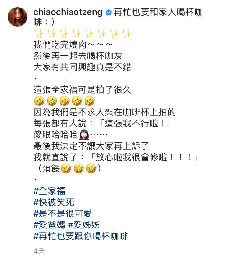 曾之喬雖然工作繁忙,但也不忘和粉絲互動、分享生活,她11日在IG上曬出一張全家福,在內文中提到和家人吃完燒肉後又到了咖啡廳續攤,開心地表示「再忙也要和家人喝杯咖啡」、「愛爸媽」、「愛姐姐」。