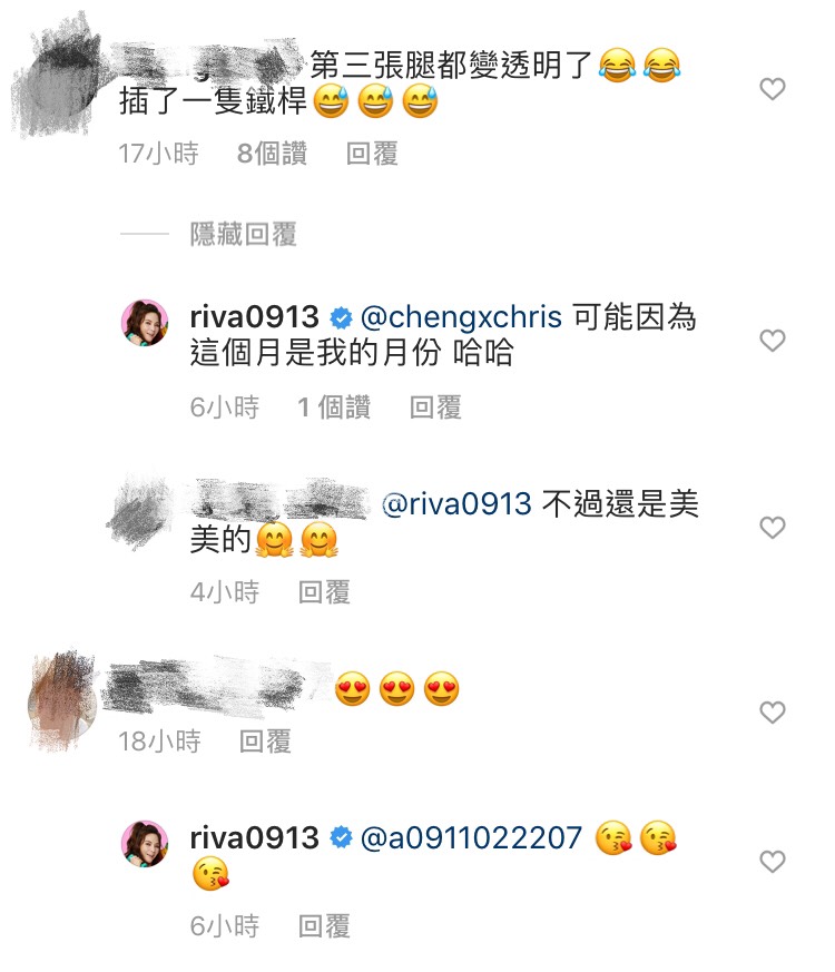 不過,也有眼尖的網友發現,第三張照片中,原本應該是皮膚色的小腿竟然變成透明的,微微透出後方的高架椅桿,疑似是修圖沒修好,粉絲們紛紛笑說:「第三張腿都變透明了,插了一支鐵桿」、「修的太過,鞋子扭曲變形了」,但面對網友的調笑,小甜甜選擇自我調侃「可能這個月是我的月份」、「可能鬼月的我就是這樣」讓網友紛紛大讚她高EQ,表示「還是很漂亮」
