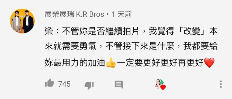 影片結尾,她也感性向粉絲喊話「我愛你們,謝謝你們六年來的支持」粉絲也紛紛回應「差點噴淚」、「看到哭個不停」、「知道沛莉的第一部影片是仿妝謝金燕,剛剛回去找,發現已經是6年前的影片了,沒想到已經過了這麼久」同為youtuber的「展榮展瑞」也在影片底下留言鼓勵她「改變本來就需要勇氣」、「一定要更好更好再更好」