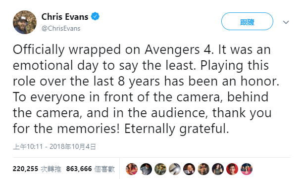 然而克里斯伊凡曾在專訪中透露,《復仇者聯盟4》殺青時他嚎啕大哭。克里斯透露要殺青前一個月「我每天都會上工,心裡充滿回憶和感激之情」,並透露片場最後一天「我是放聲痛哭,我哭得很輕鬆,但絕對是嚎啕大哭的那種」。結束英雄旅程,克里斯伊凡將轉向更深層的角色,近期以「美國隊長」的經典蓄鬍造型現身Netflix全新原創電影《紅海深潛密援》,作品已在上月31日播出。