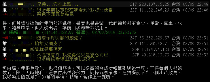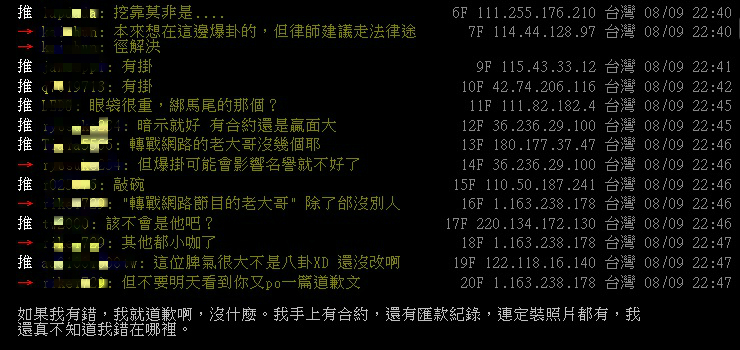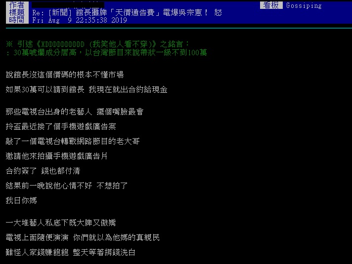 日前有一位鄉民在PTT上發文指出,「說館長沒這個價碼的,根本不懂市場!如果30萬可以請到館長,我現在就出合約給現金。」同時也點名電視台轉戰網路節目的老大哥,最會擺個嘴臉,該名鄉民稱自己「親身經歷」,當時他接手一個手機遊戲廣告案,邀請這位綜藝界老大哥代言,雙方接觸後,並簽完合約、付清酬勞,沒想到拍攝前一晚,對方竟說「心情不好,不想拍了」。