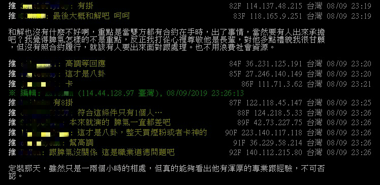 該名鄉民氣到飆髒話,提到一大推藝人私下大牌又傲嬌,「電視上隨便演演,你們就以為他X的真親民。難怪人家錢賺飽飽,整天等著捐錢洗白」,不過並沒有揭曉對方真實身分,引起網友紛紛猜測,有網友留言說:「這暗示好明顯的感覺?」、「笑死,這才是我要的八卦版」、「八卦回來了!」、「這篇必須爆」、「還猜錯,這條件只有一個人符合啦」、「八卦回來了,這超明顯啊!」有網友更表示符合條件的人其實不多。
