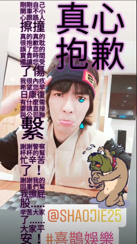 蕭敬騰稍早在IG限時動態發文表示,稍早自己開車不小心跟路人擦撞,內疚發文向對方道歉,「真的真的很抱歉耽誤了您的寶貴時間,還讓您受了傷,我很內疚,希望您早日康復。」也強調對方若有甚麼需求都可以直接跟公司聯繫,並向協助處理的警方及同事道謝,「謝謝警察杯杯的幫忙,辛苦了!謝謝我的同事們幫我擦屁股…辛苦大家了…大家平安!」