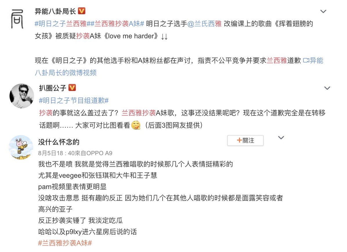 目前熱播的選秀節目《明日之子3》由導師華晨宇、孟美岐、孫燕姿等人領軍,從第一期播出就成為熱門話題,在節目中也挖掘了許多天賦異稟的選手們,本季節目分為兩個賽道:start以及restart,目前節目也進行到九大廠牌衝刺戰,然而在第7期中,選手們迎來最後一次考核的舞台,其中一位人氣選手「蘭西雅」卻被爆出歌曲抄襲Ariana Grande的《love me harder》,消息一出許多網友揚言要她退賽。