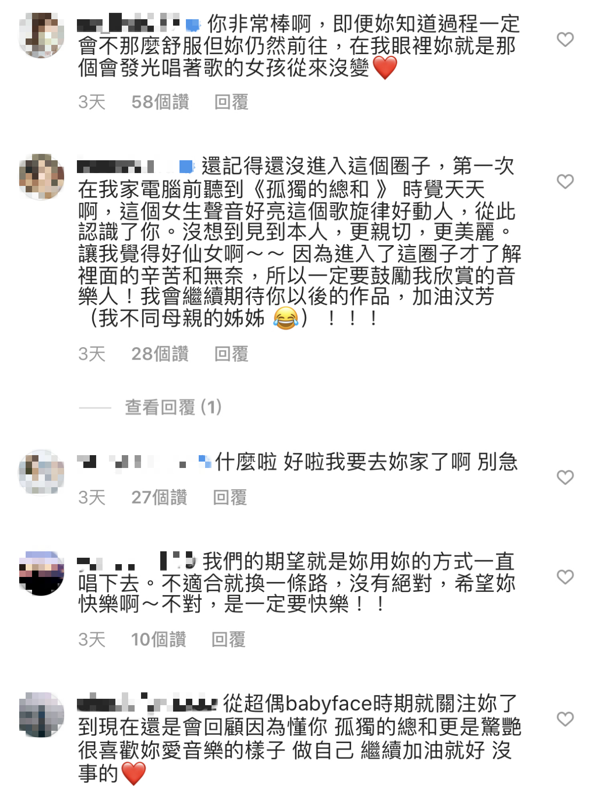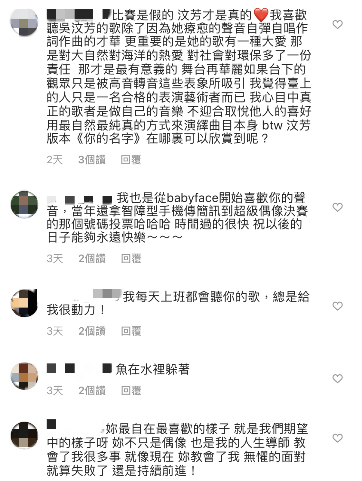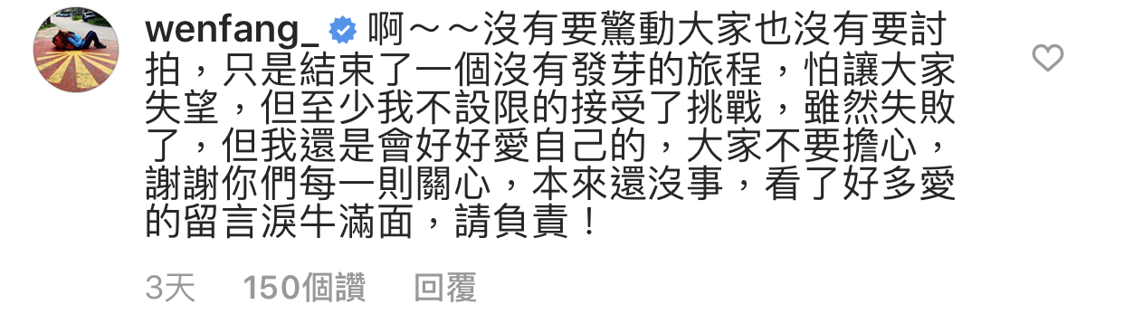 雖然不確定發生什麼事,粉絲依舊心疼的在留言鼓勵吳汶芳,並表示無論如何都會繼續支持,「你非常棒啊,即便妳知道過程一定會不那麼舒服但妳仍然前往,在我眼裡妳就是那個會發光唱著歌的女孩從來沒變」、「就是喜歡妳最初的樣子啊,開心的唱歌就好了」、「Just be yourself. 真正欣賞你的人會看見你的努力並支持你的!」,看到大家關心的留言,吳汶芳感動的回應「只是結束了一個沒有發芽的旅程,怕讓大家失望,但至少我不設限的接受了挑戰,雖然失敗了,但我還是會好好愛自己的,大家不要擔心」。希望吳汶芳能繼續堅持音樂夢想,創作更多動人的歌曲。