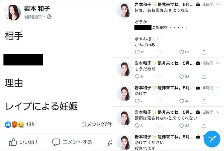 而早在案發前,岩本和子就已經在社群網站留言處貼出一連串詭異發言,包括「請救救我,我會被殺」、「被強姦後懷孕」等字眼。隨後根據日媒指出,岩本和子和企業家發生關係後懷孕,事後才知道對方早有家室,自己無辜變成小三,疑似因此而埋下殺機。
